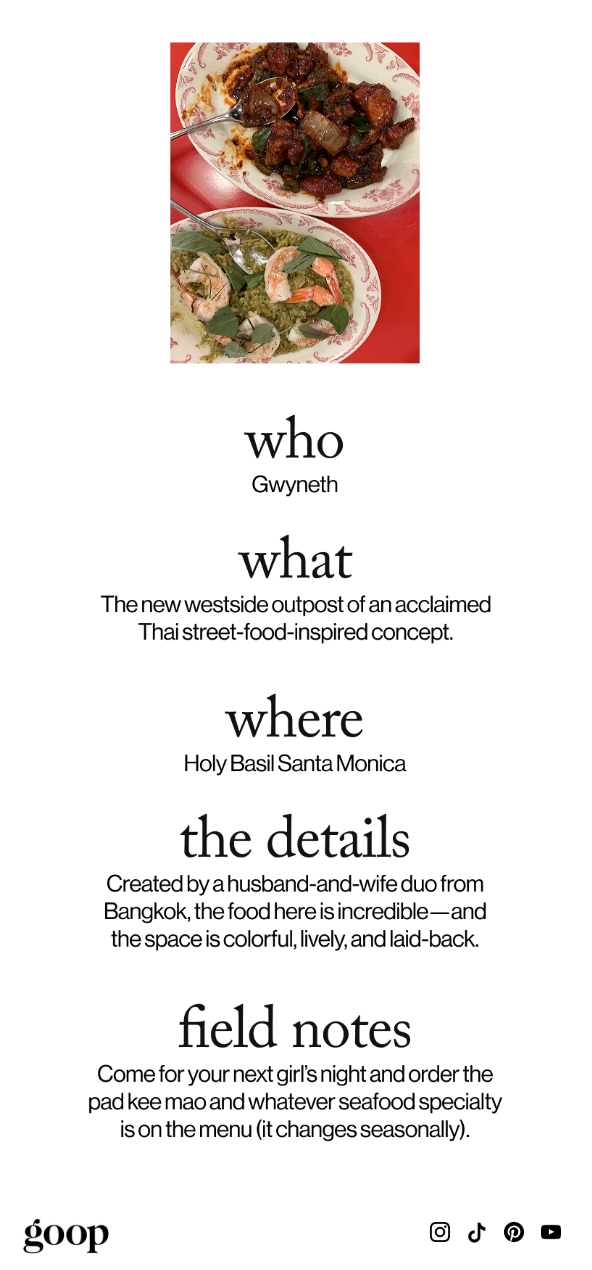One of the aspects I love the most about Goop’s Thursday newsletters is how they close every issue: a non-professional photograph followed by a simple and sophisticated list of headers (who, what, where, the details, field notes) that provide further details about the object, location, product, or individual showcased in the photograph. “Insider” tips, minus the condescension.